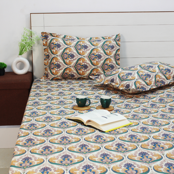 Floral 210 TC Fitted Bedsheet with Pillow Covers - Multicolor