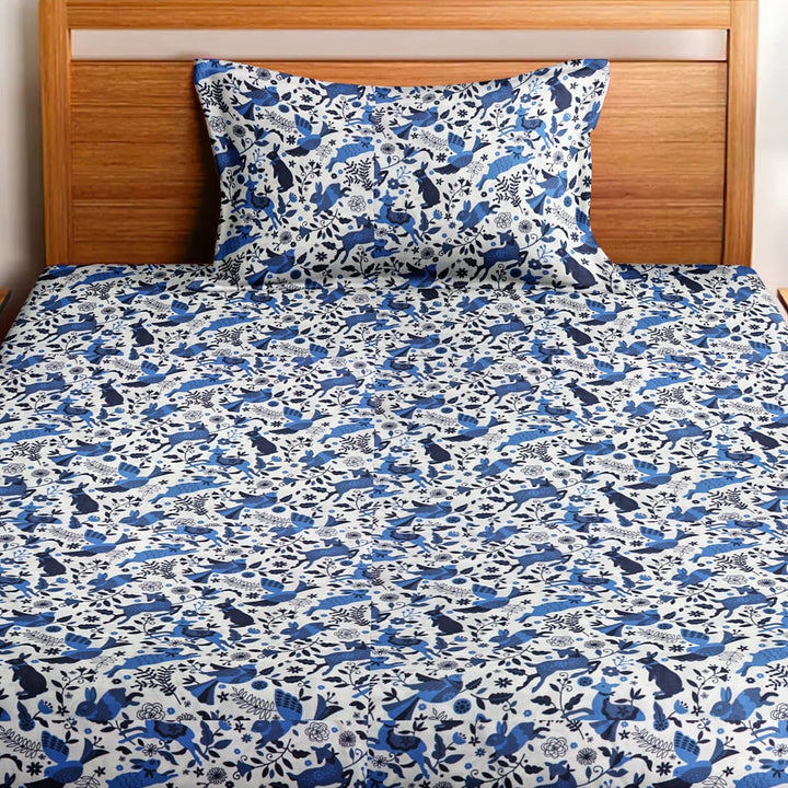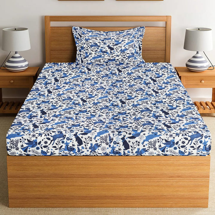 Digital Print Single Fitted Bedsheet with Pillow Covers for Kids - Blue