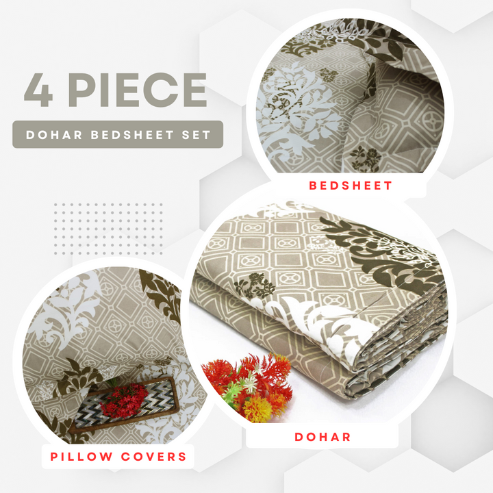 • Set Contents : 1 Fitted Bedsheet, 2 Pillow Covers, 1 Dohar