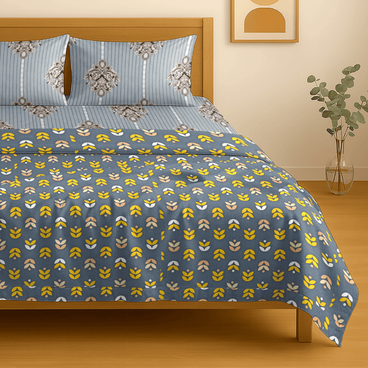 Festive Double Bed Dohar & Bedsheet Combo Set - Geometric Petals Blue