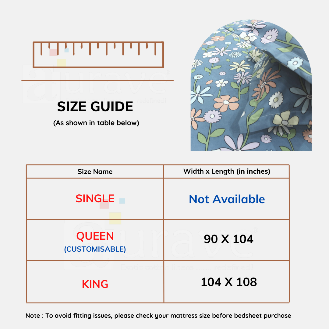 - KING SIZE BEDSHEET : 104 inch x 108 inch (264 cms x 274 cms)